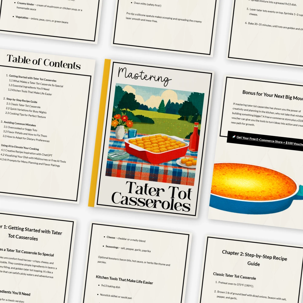 Unlike basic recipe blogs or short PDFs, this guide gives you more than just instructions. It shows you why certain techniques work, helps you avoid frustrating mistakes, and even introduces creative ways to use AI tools like ChatGPT and MidJourney for meal planning and dish visualization. It’s not just another tater tot casserole recipe guide. It’s a complete learning resource designed to level up your skills in the kitchen.
