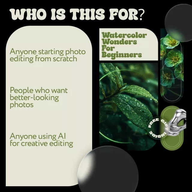 This eBook is perfect for beginners, hobby photographers, content creators, small business owners, and anyone who wants to learn how to edit photos for social media, websites, or personal projects. No advanced technical background is required.