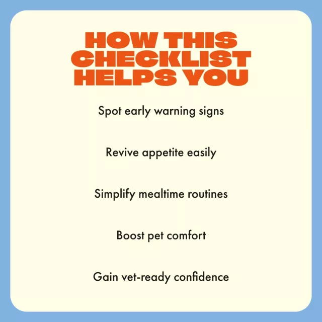 So glad I found this checklist! My dog suddenly lost interest in her food and it was such a worry. The tips on observing behavior and noting changes were super helpful, gave me peace of mind knowing what to look for.