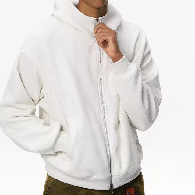 Unlike bulky winter coats, this hoodie jacket is made to keep you warm without weighing you down. The knit fabric combines soft cotton with durable polyester, giving you a smooth feel on the inside and strong wear on the outside. The double zipper design lets you adjust your fit and airflow while adding a unique layered look that stands out in any casual outfit.