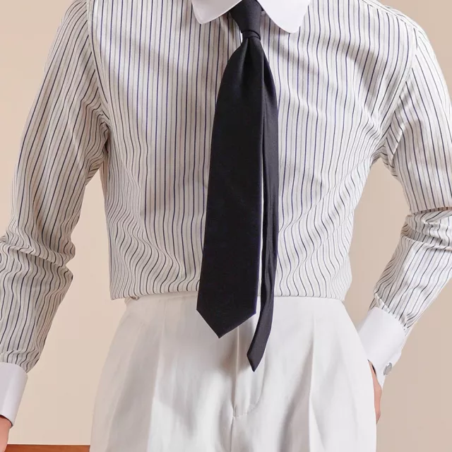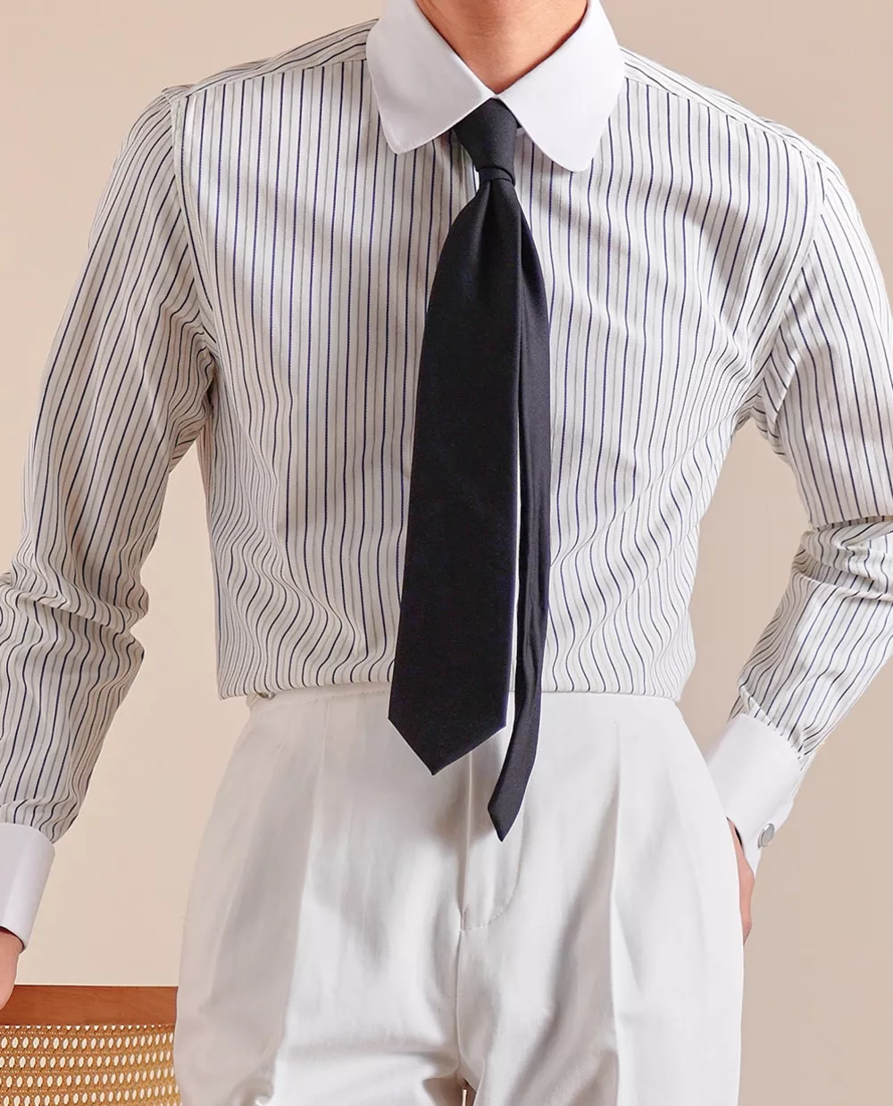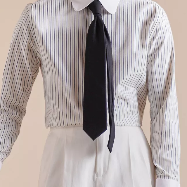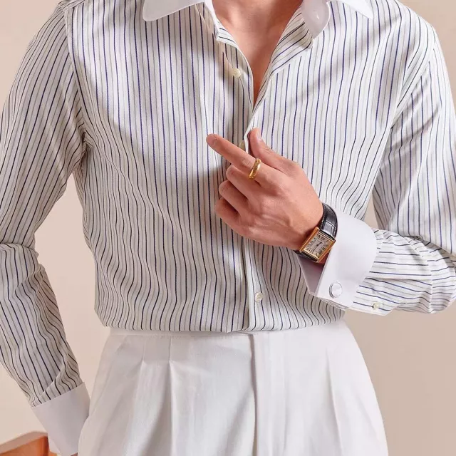Its rounded turn-down collar and full-length sleeves add a refined touch, while the clean striped design gives it a fresh, sophisticated look. The fabric features durable broadcloth weaving, ensuring a smooth finish that holds its shape throughout the day. With a single-breasted closure and versatile silhouette, this shirt is ideal for year-round wear—spring, summer, fall, and winter.