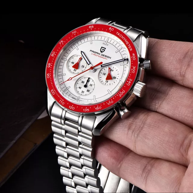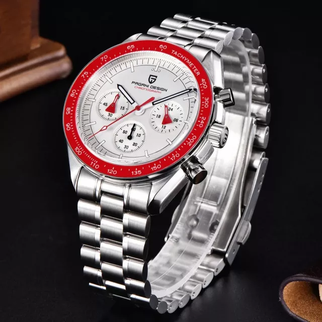 Step into the world of refined elegance and adventure with this men’s luxury quartz chronograph watch. Built for those who demand both performance and style, it combines sleek aesthetics with robust functionality. Featuring a striking red sapphire bezel and newly added AR-coated sapphire glass, this watch is designed to make a statement while delivering crystal-clear visibility in any light. The classic black dial, paired with luminous white hands and indexes, ensures effortless readability day or night.