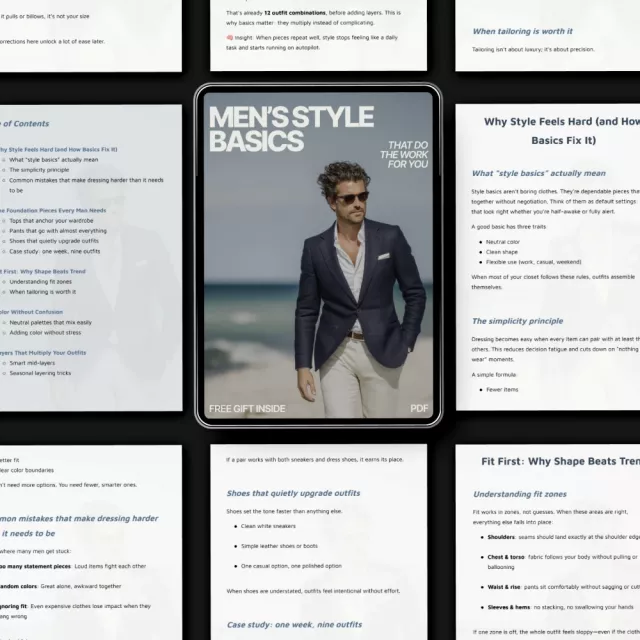If getting dressed feels harder than it should, this ebook was made for you. Men’s Style Basics That Do the Work for You is a practical, no-fluff guide that shows how the right basics quietly solve most style problems. Instead of chasing trends or buying more clothes, you’ll learn how to build a simple system where pieces work together naturally. This guide answers the real question most men have: what mens style basics make dressing easy — and how to use them in real life.