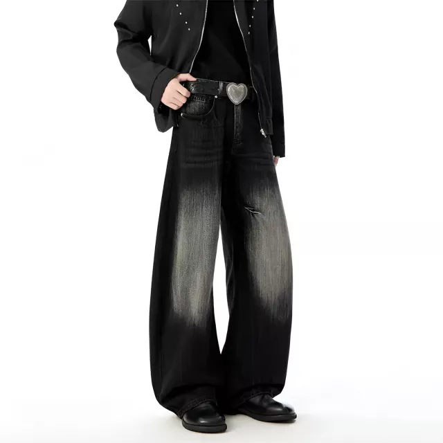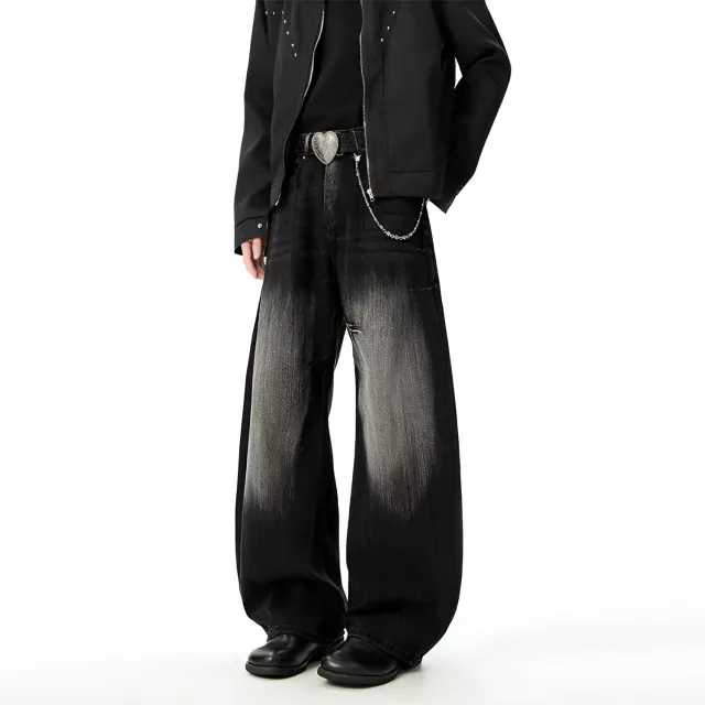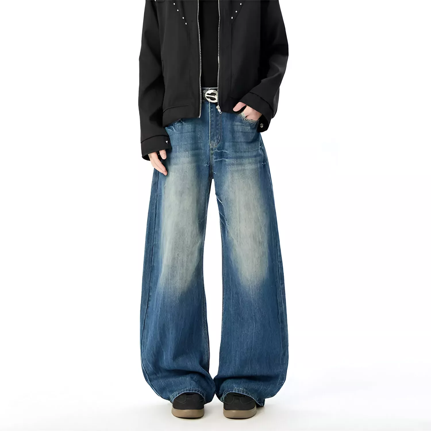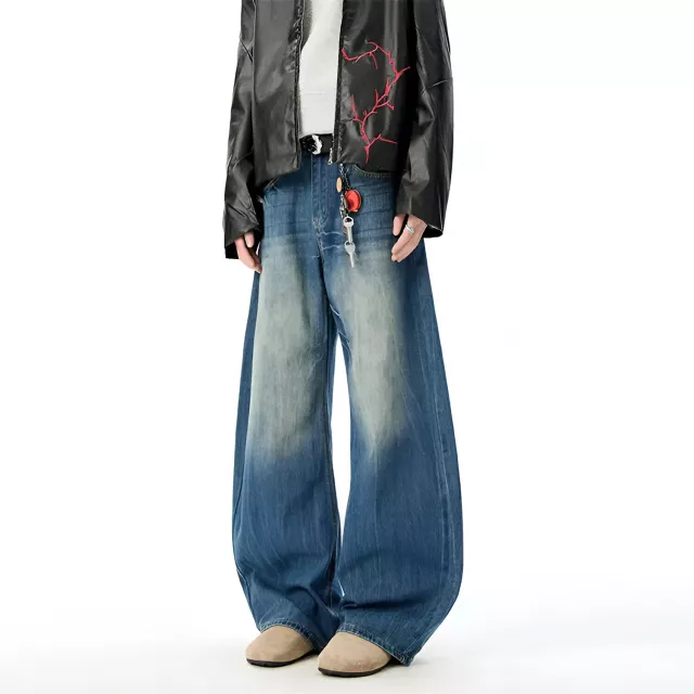 What sets these jeans apart is their unique curved-knife cut combined with a wide-leg profile. This design creates a strong visual flow down the legs, making your outfit look more structured while still relaxed. The contrast washing adds depth and character, so they do not look flat or boring like standard denim.