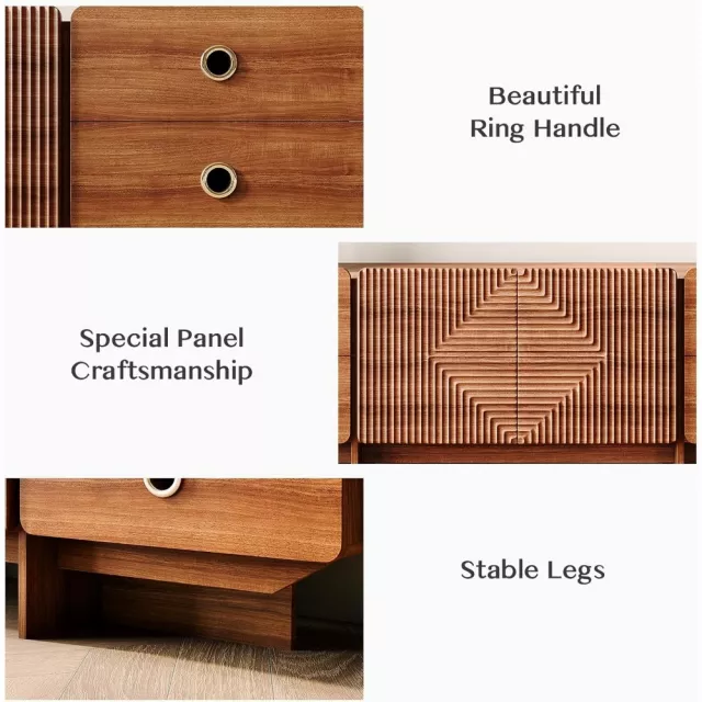With its warm brown or walnut finish, this stand adds a cozy yet sophisticated touch to any modern or boho-inspired space. Its rectangular shape and fluted detailing create visual interest, while its robust wooden construction provides reliable support for even the largest televisions. Whether you’re redecorating or setting up your first entertainment area, this stand is sure to impress.