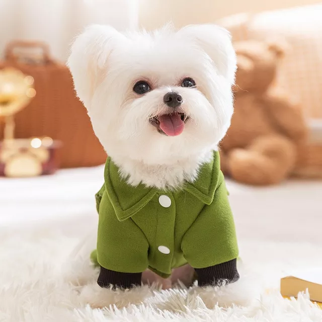 This pet outfit comes in a classic green color with a trendy uniform design. Made of lightweight yet warm polyester, it ensures breathability while maintaining comfort. The pullover style makes it easy to put on and take off, and the four-leg design keeps your pup fully covered for maximum warmth. With sizes ranging from XS to XL, it fits small dogs up to about 16 pounds. Chest and back measurements are included for a precise fit, so your pup can move freely without restriction.