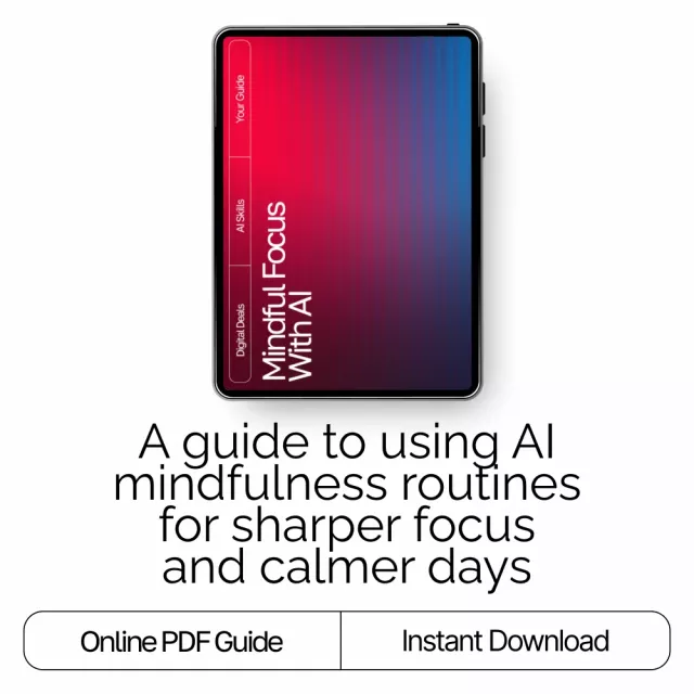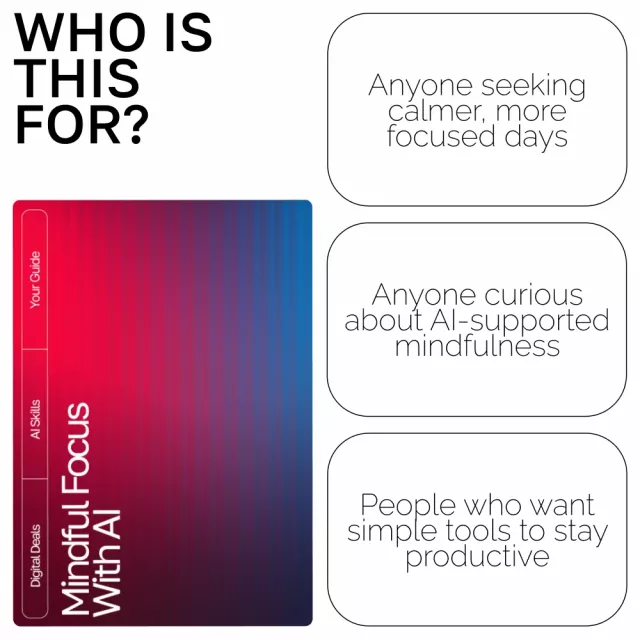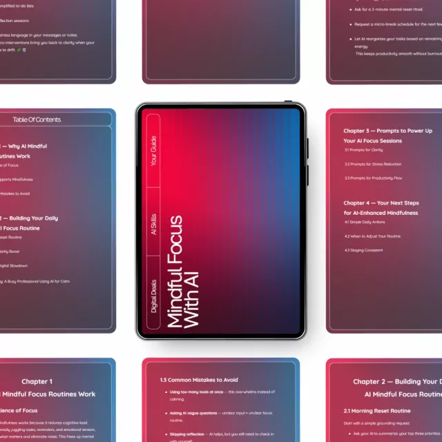 Discover a clearer mind, calmer days, and more intentional focus with Mindful Focus with AI—a beautifully designed digital guide that shows you how to use AI to build sustainable, stress-reducing focus habits. Whether you’re juggling work, creativity, or everyday responsibilities, this guide helps you create ai mindful focus routines that feel natural, empowering, and easy to maintain.