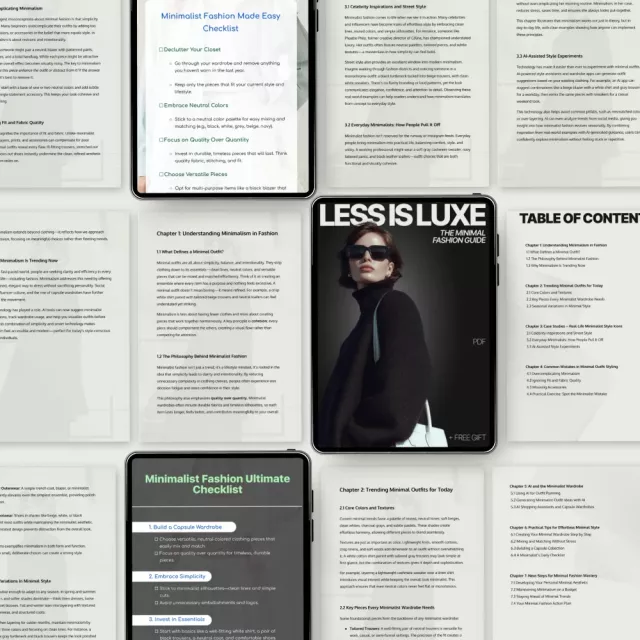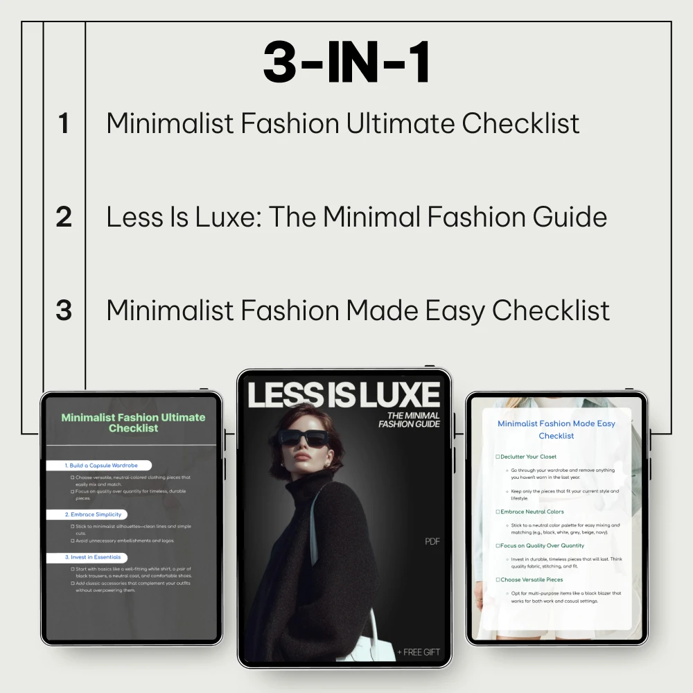 Discover the ultimate resource to simplify your wardrobe and stay ahead of the latest fashion trends. Our Minimal Trends Toolkit for Outfit Planning is the perfect solution for anyone looking to create a stylish, minimalist wardrobe without the stress. This 3-in-1 bundle includes essential guides, checklists, and eBooks that will help you curate a wardrobe that is both chic and effortlessly functional. Whether you’re new to minimalism or looking to refine your wardrobe, this toolkit will help you achieve a sleek, organized look that’s tailored to your lifestyle.