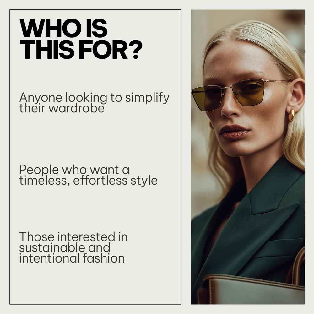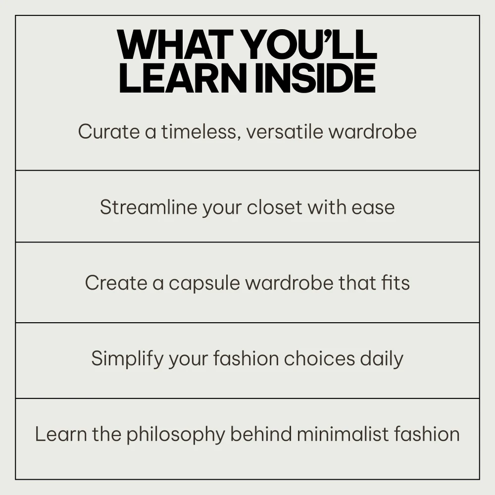 • Comprehensive resources: Unlike other minimalist fashion guides, our bundle goes deeper than just “what to wear” by addressing the philosophy behind minimalist fashion, helping you adopt it in a meaningful and sustainable way.
