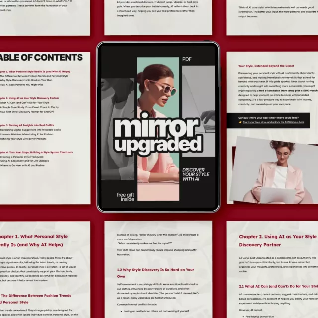 Are you tired of the endless cycle of fashion trends that never seem to quite match your personal style? Mirror, Upgraded: Discover Your Style with AI is the perfect guide for anyone looking to unlock their unique style, with the help of cutting-edge AI. This digital download is packed with actionable insights, expert tips, and easy-to-follow strategies for discovering and refining your personal style using AI. Whether you’re looking to declutter your closet, develop a wardrobe that truly represents you, or simply gain a deeper understanding of your fashion preferences, this guide is your new best friend.