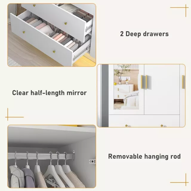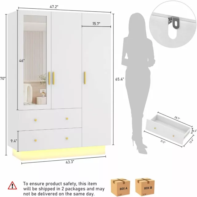 Measuring 19.7″D x 47.2″W x 70.1″H, this elegant closet features a full storage system divided into three practical areas: a spacious hanging section for coats, dresses, and shirts; a stacking area for folded garments and accessories; and two large lower drawers perfect for private items or seasonal pieces. At the center, a clear half-length mirror (46.4″ H x 11″ W) helps you get ready with ease, reflecting your full look effortlessly in natural or ambient lighting.