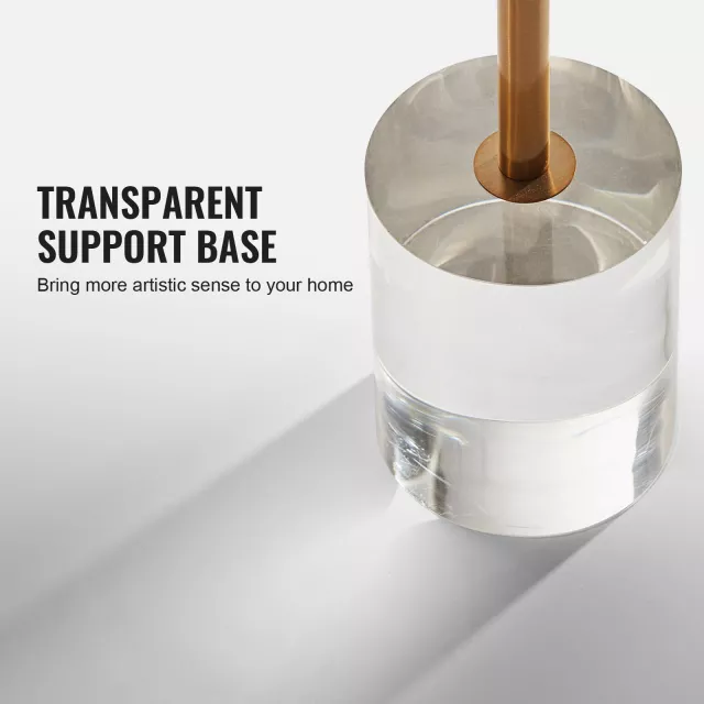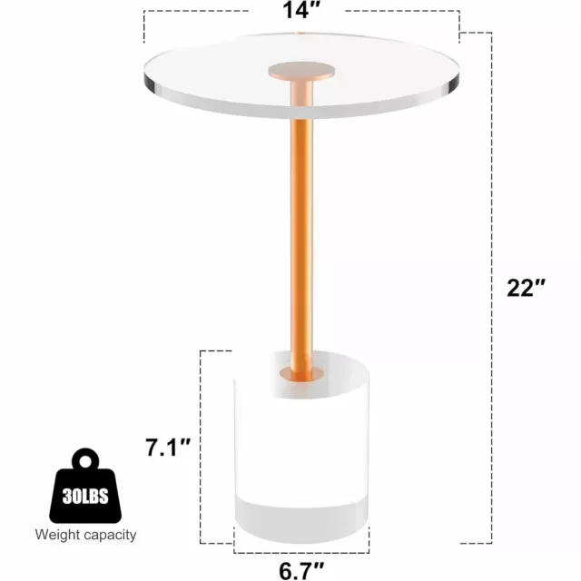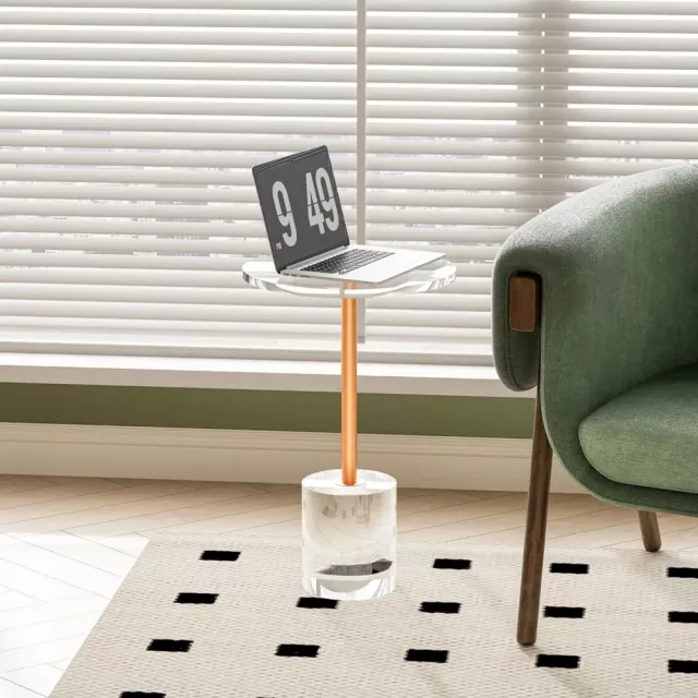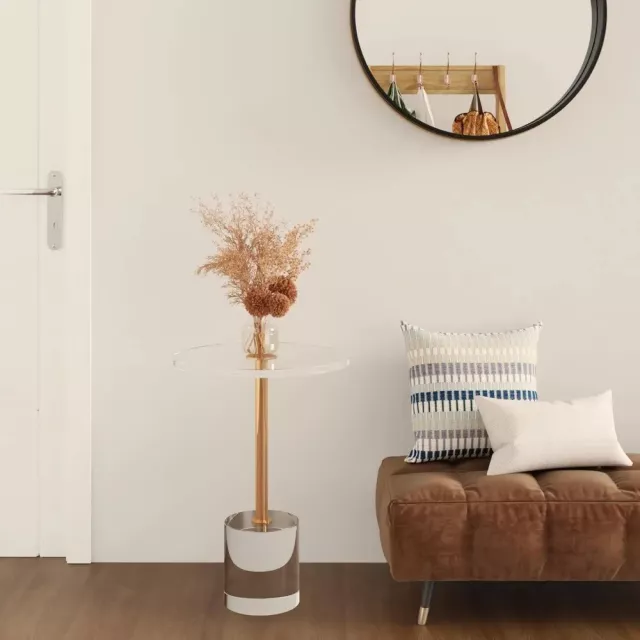 This table stands out with its mixed-material construction that combines crystal-clear acrylic and metallic gold accents. The acrylic tabletop offers a sleek and transparent surface, while the gold metal post adds a touch of luxe. Its compact size, measuring just 14 inches in diameter and 22 inches in height, makes it an ideal addition to small apartments, living rooms, or home offices where space is precious. The rounded edges not only add to the modern aesthetic but also ensure safety by eliminating sharp corners.