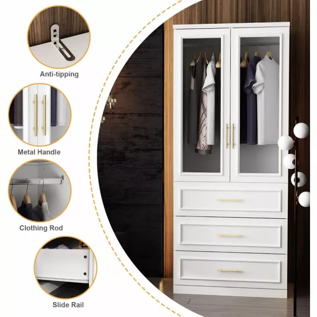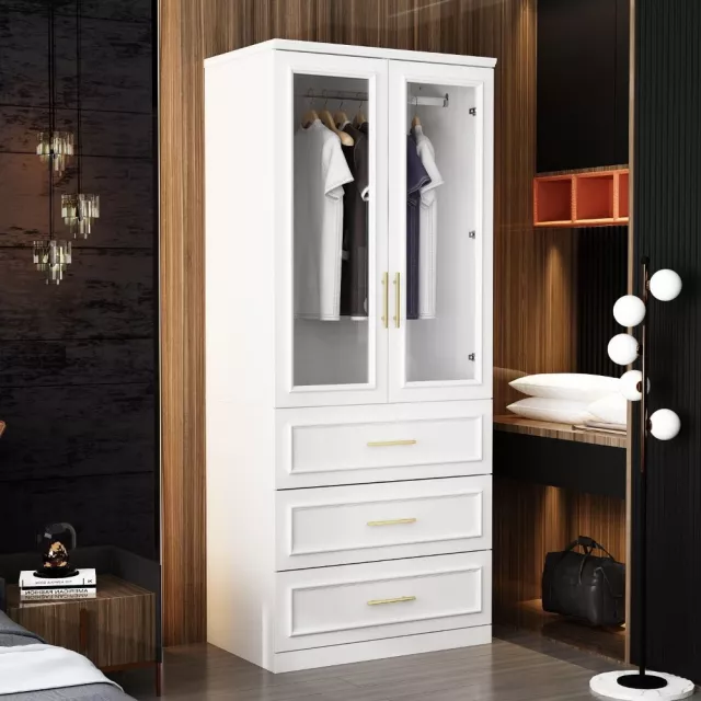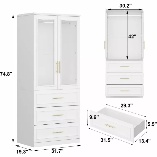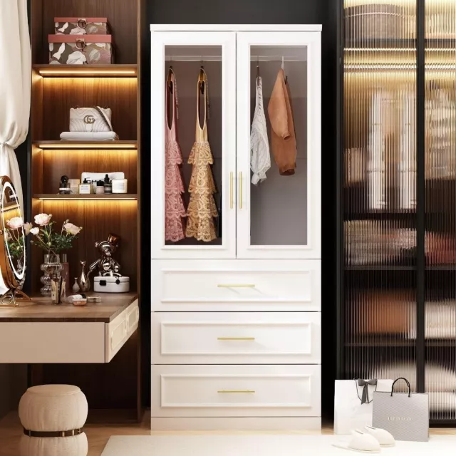 This wardrobe closet is designed to meet your daily storage needs. Behind the glass-paneled double doors, a sturdy hanging rod provides ample space for your coats, dresses, uniforms, and more. Below, three generous drawers are ideal for storing underwear, socks, linens, or folded garments. The gold metal handles lend a refined contrast, making it as beautiful as it is practical. Use it every day to keep your room tidy and your belongings organized.
