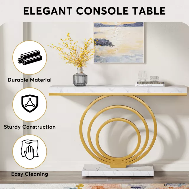 The faux marble surface paired with a sturdy metal frame creates a luxe yet durable structure. The smooth, veined marble finish offers a premium look without the heavy weight or maintenance of real stone. Supported by three symmetrical internal ring structures, this narrow table is not only visually striking—it’s a conversation starter. Measuring 13.7 inches deep and 31.5 inches tall, it fits snugly in tight hallways or behind sofas while still offering ample surface area.