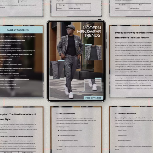 Modern Menswear Trends is a clear, modern ebook designed to help men understand what actually matters in style right now. Instead of chasing hype or disposable looks, this guide breaks down fashion trends men should know in a way that feels realistic, wearable, and confidence-building. Whether you’re upgrading your daily outfits, refining your professional wardrobe, or simply tired of buying clothes you don’t wear, this ebook gives you a smarter way forward.