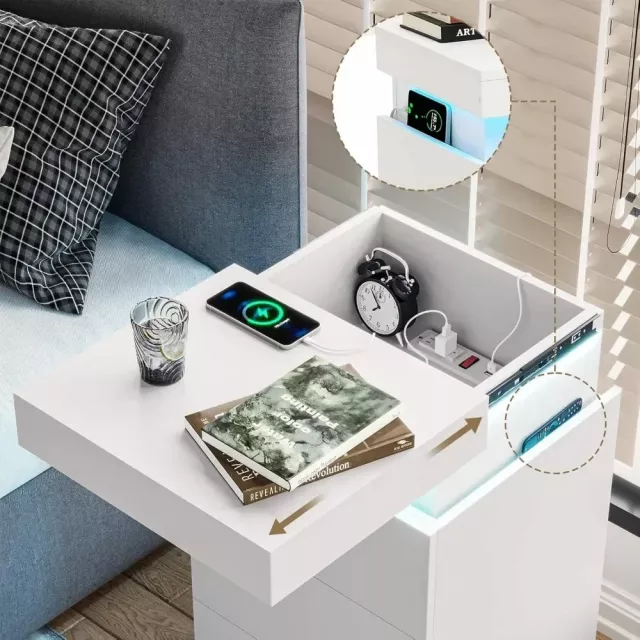 With its clean lines and minimalist modern style, this end table fits perfectly beside your bed, couch, or reading nook. But what truly sets it apart is the thoughtful blend of advanced features and stylish design details. The sliding top reveals a hidden charging station tucked neatly inside the top drawer—offering 2 power outlets, 2 USB ports, and an on-off switch to charge phones, tablets, or other electronics while keeping cords out of sight.