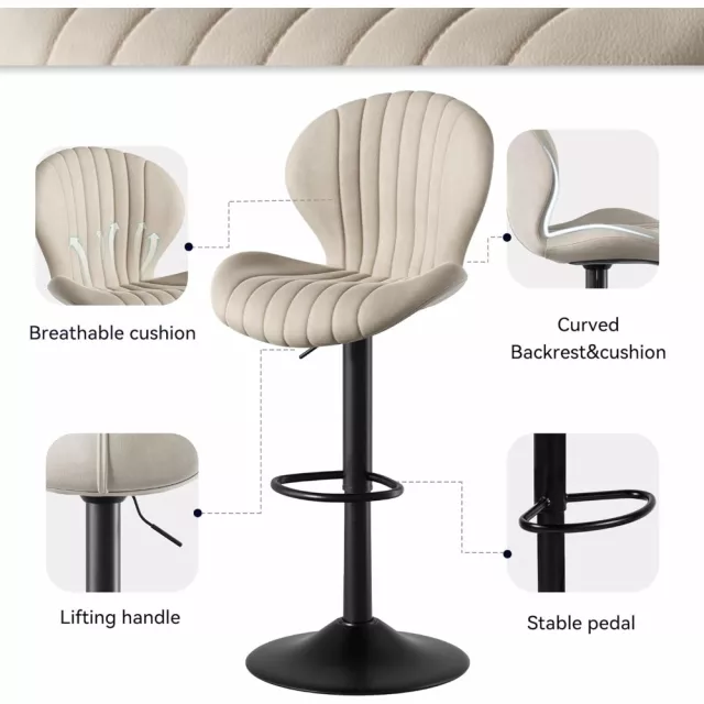 Each stool features a high-density sponge cushion wrapped in soft, synthetic leather for a plush and supportive seat. The ergonomic high backrest provides added support for extended seating, while the 360° swivel function allows for smooth, effortless rotation—perfect for engaging with guests or enjoying flexible movement while you sit.