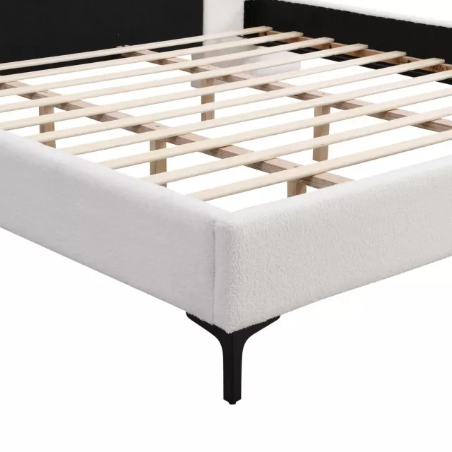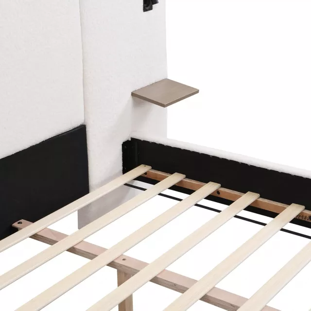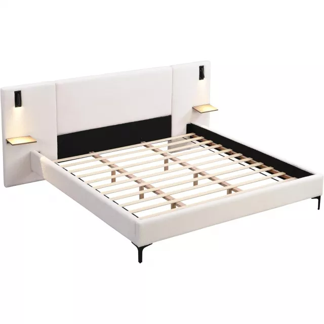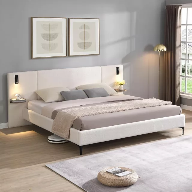 Transform your sleep space into a modern sanctuary with this thoughtfully designed upholstered bed frame. Blending style and practicality, it features a soft boucle headboard, built-in reading lights, and convenient storage shelves—all in one sleek package. Whether you’re winding down with a book or reaching for your nightly essentials, this bed makes everything effortless. Its clean white finish and airy design bring a fresh, inviting look to any bedroom, while the durable build ensures years of support and stability.