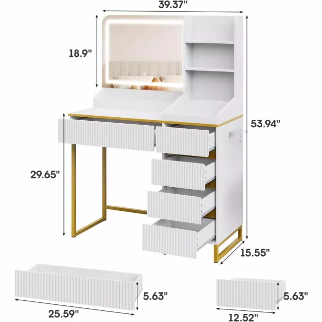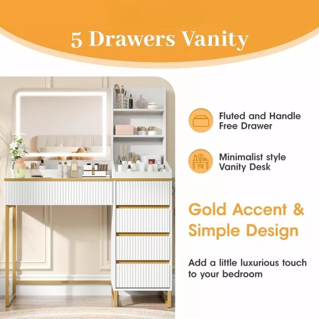 Spacious and thoughtfully designed, this vanity includes 5 smooth-gliding drawers, 3 tabletop storage compartments, 2 upper display shelves, and 1 open cubby below the mirror—perfect for keeping cosmetics, jewelry, and accessories neatly organized and close at hand. The handle-free drawers feature a graceful wavy pattern with gold accents, blending minimalism with modern charm.
