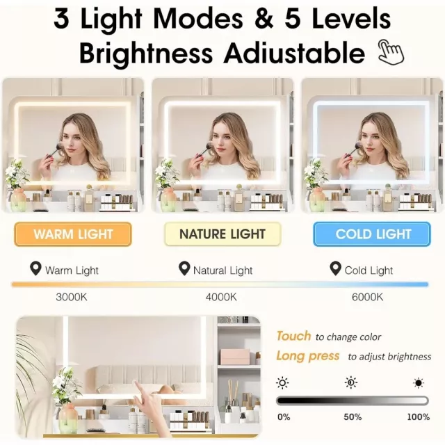 Featuring a smart LED mirror with adjustable lighting, you can easily switch between warm yellow, warm white, and cool white tones to match any time of day or mood. Say goodbye to poor lighting and uneven makeup application. With a built-in power outlet and a sturdy hair dryer holder, your styling tools are always within arm’s reach and ready to use.