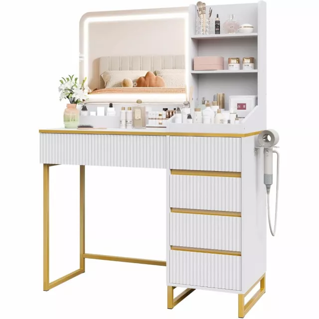 Step into a world of beauty and convenience with this stunning modern vanity desk. Designed with a crisp white finish and elegant gold metal accents, this piece brings a fresh, stylish touch to any bedroom. Whether you’re getting ready for work or preparing for a night out, this vanity desk offers everything you need to create your perfect look, all in one elegant setup.