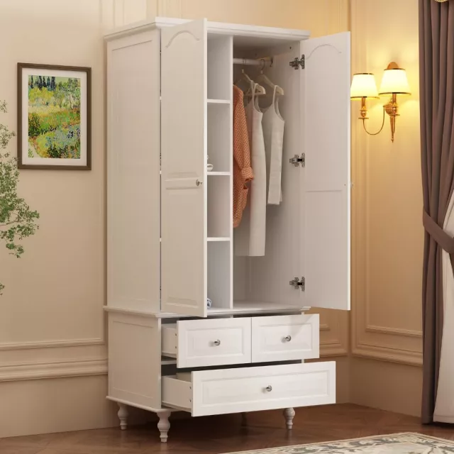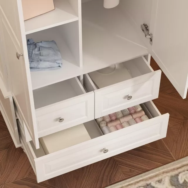 Behind its two full-size doors, you’ll find multiple shelves for organizing folded clothes, linens, or storage bins. A sturdy hanging rod offers the perfect place to store longer garments like coats and dresses without creasing. Below, three smooth-gliding drawers offer additional hidden storage, perfect for accessories, undergarments, or off-season essentials.