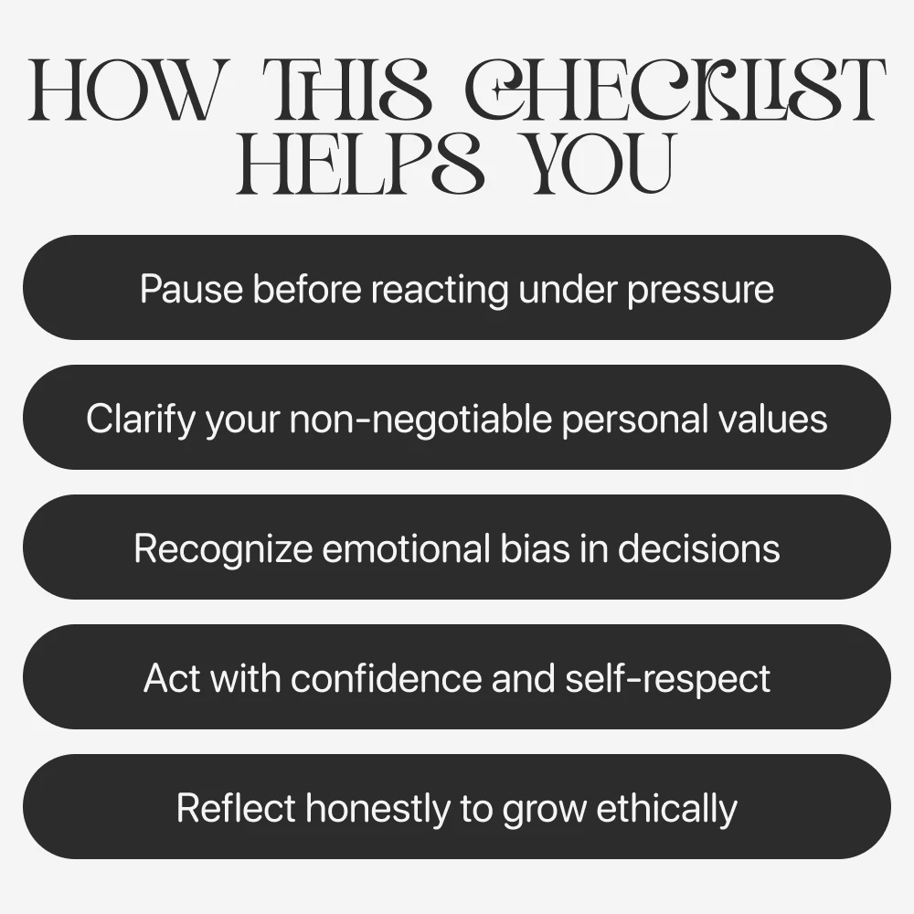 This digital checklist is perfect for anyone who values authenticity and wants to make choices they can stand behind. Whether you’re facing a personal dilemma, professional crossroad, or everyday ethical decision, Moral Compass in Action helps you stay aligned with your principles—without second-guessing your conscience.