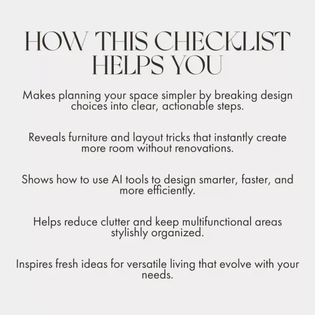 Stop struggling with cramped layouts and clutter. Download the Multi-Functional Living Space Checklist today and start turning every square foot of your home into a flexible, functional masterpiece. Perfect for anyone who wants to master how to create multi functional living spaces with confidence and creativity.
