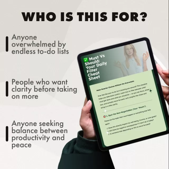 Clarity is only one download away. Get your copy of the Must vs Should: Your Daily Filter Cheat Sheet now and start focusing on what truly moves the needle in your life. Reclaim your time, energy, and priorities—because you deserve less overwhelm and more progress.