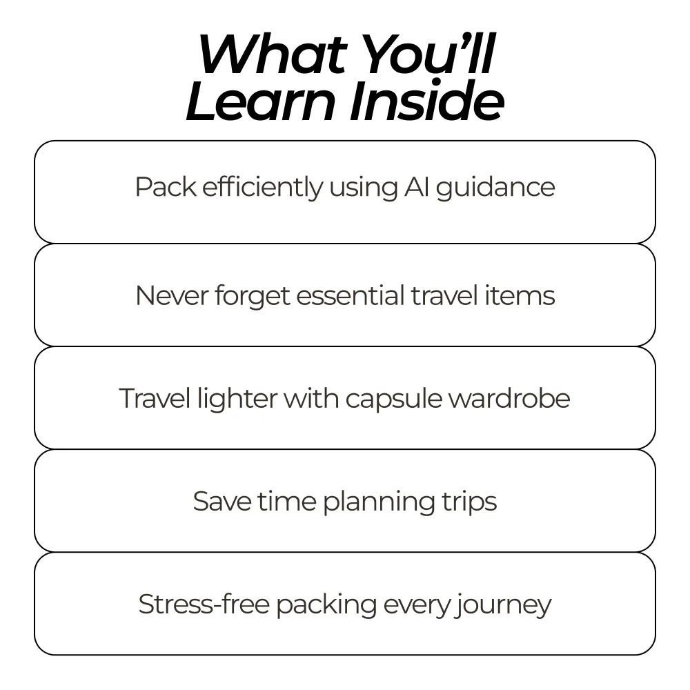 This bundle is perfect for anyone looking to master travel packing using modern technology. Whether you’re a frequent flyer, a weekend getaway enthusiast, or planning your first big trip, this AI-powered system helps you pack efficiently, avoid overpacking, and ensure nothing is left behind.