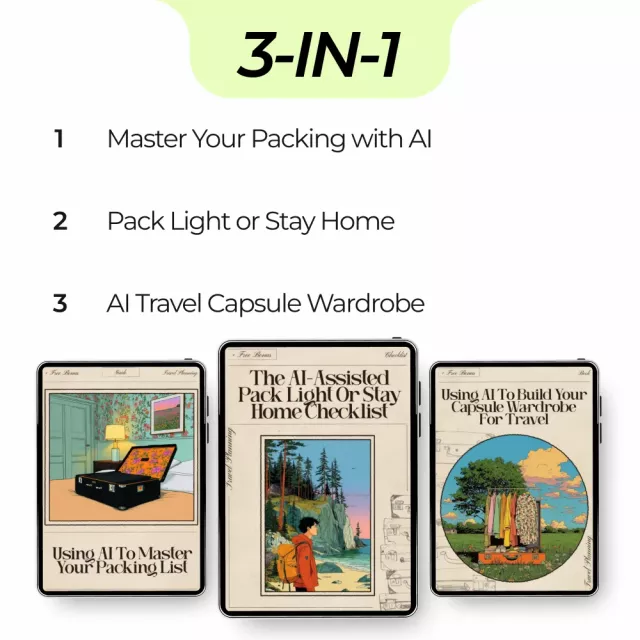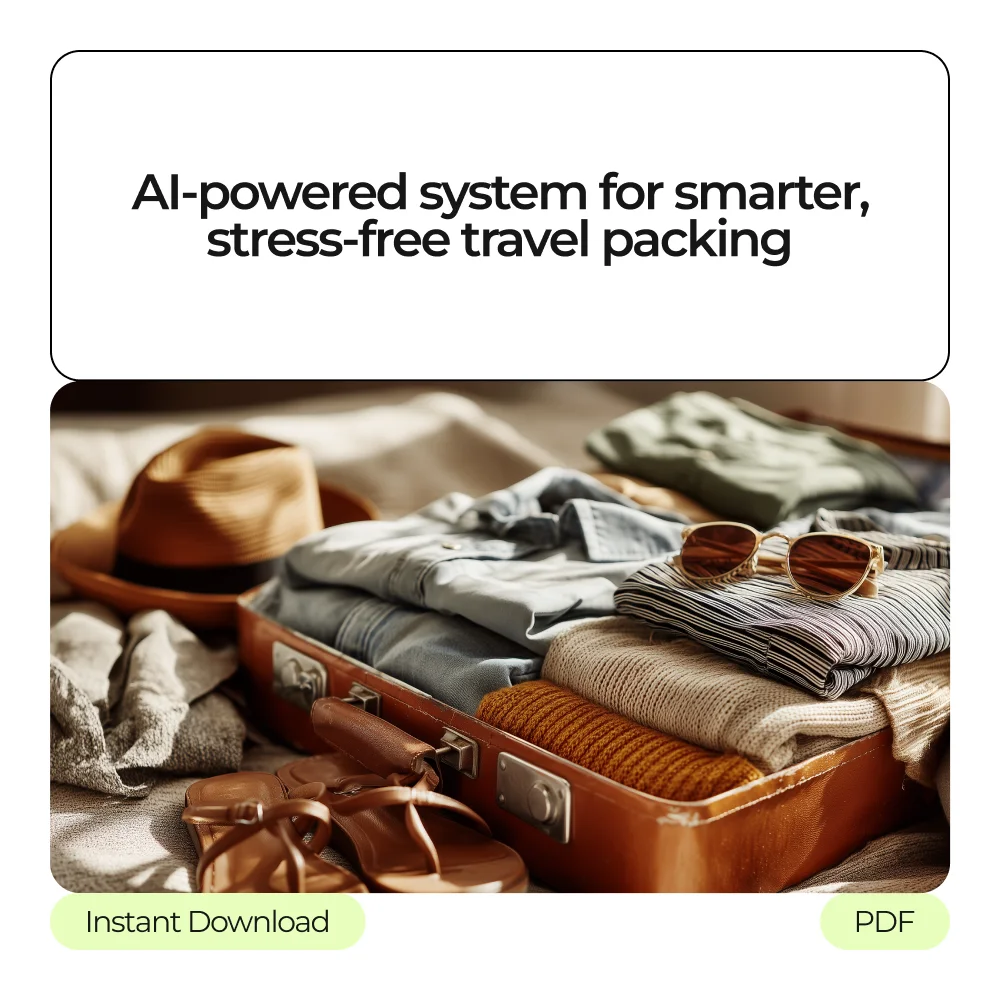 Say goodbye to last-minute packing stress and forgotten essentials with Never Forget a Thing The AI Packing System. This comprehensive 3-in-1 digital bundle is designed to help travelers streamline their packing process, optimize luggage space, and feel confident every time they hit the road. Using AI technology, these guides, checklists, and eBooks make planning your packing effortless, no matter the destination or trip length. Perfect for frequent travelers, weekend adventurers, or anyone looking to pack smarter, not heavier.