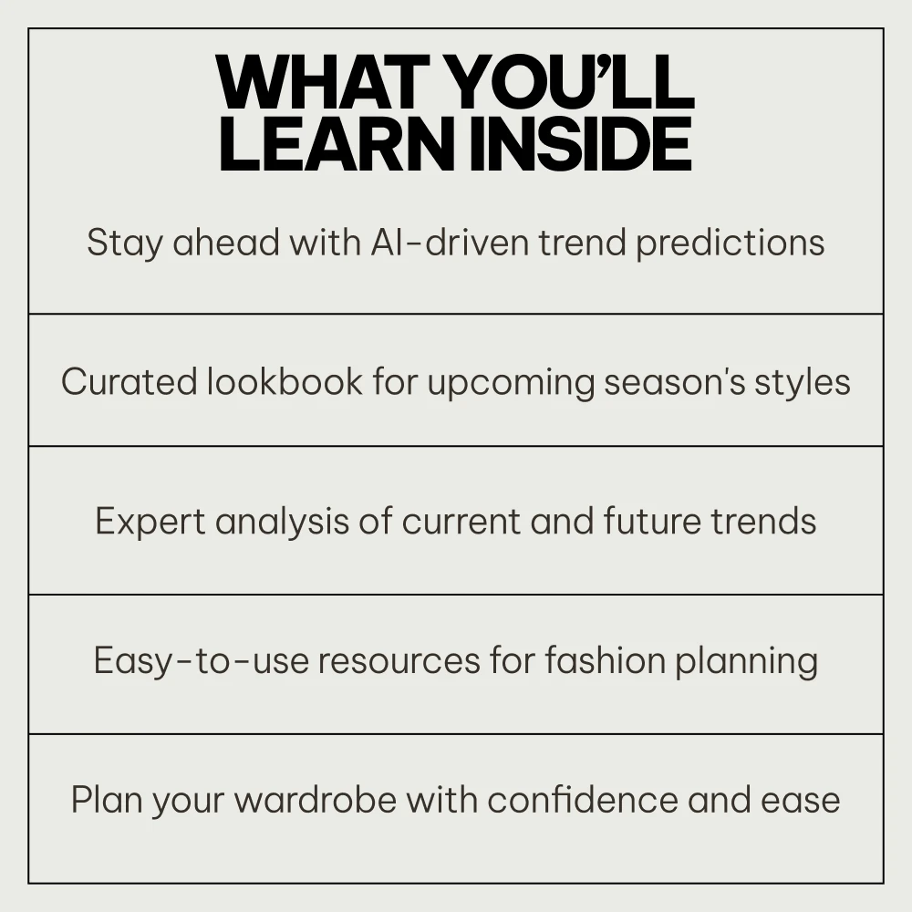 The Next-Season Trend Forecast Pack is your ultimate tool to predict, plan, and style for the upcoming season. With expert insights, AI-powered tools, and a sneak peek into next season’s lookbook, you’ll be prepared to stay on top of the latest fashion trends like never before. Download your pack now and start styling for success!