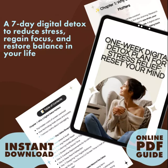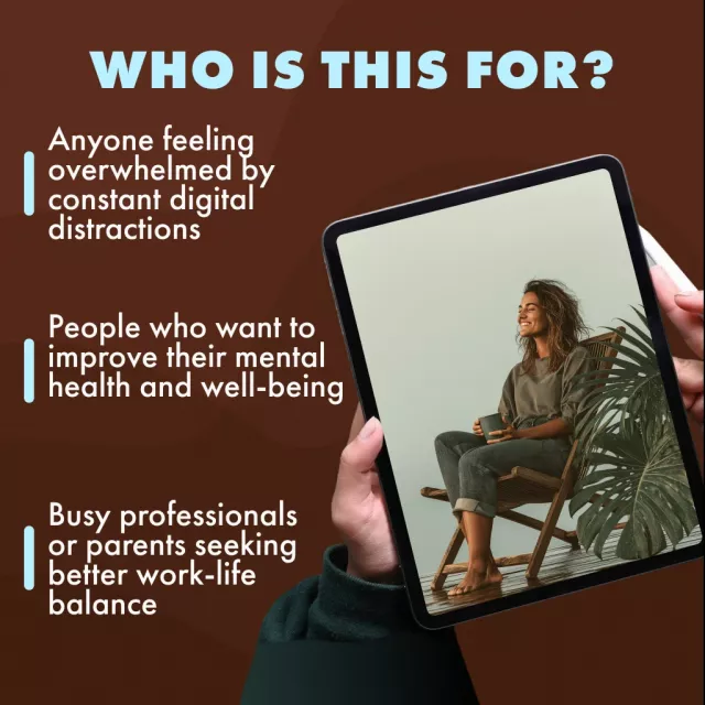 This digital detox plan is designed for anyone feeling overwhelmed by constant screen time and digital distractions. Whether you’re a busy professional, a parent, or someone looking to take better care of their mental health, this guide offers a step-by-step solution to help you reduce stress, reclaim your focus, and improve sleep quality. It’s perfect for anyone ready to embrace a more mindful, balanced lifestyle without the pressure of always being online.