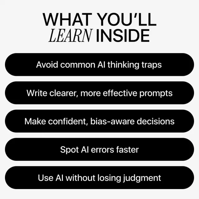 Unlike generic AI tutorials, Outsmart AI: Avoid Thinking Traps Today focuses on how humans think with AI, not just how AI works. It’s tool-agnostic, practical, and designed to improve your judgment—not replace it.