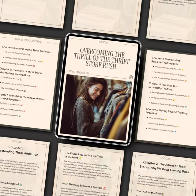 • Chapter 1: Understanding Thrift Addiction – Explore what thrifting addiction really is and the psychology behind the thrill of the hunt.