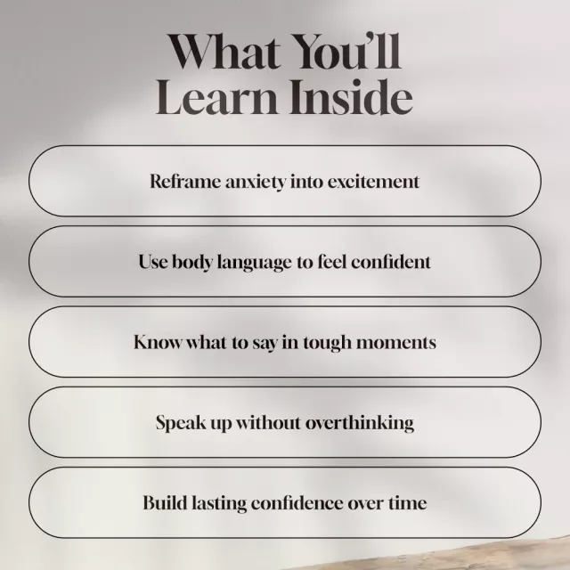 Own the Room doesn’t just tell you to “be confident.” It gives you concrete steps, relatable examples, and real-world tools to practice. It’s not about pretending to be someone else—it’s about becoming more of your best self. With easy-to-follow advice and mindset shifts, this digital download will meet you where you are and grow with you.