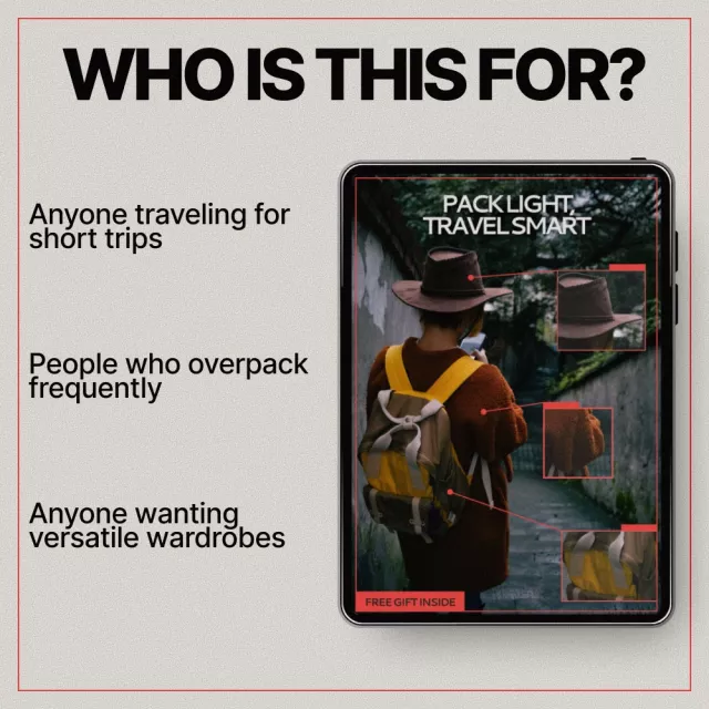 This ebook is perfect for frequent travelers, minimalists, busy professionals, and anyone tired of dragging around clothes they never wear. If you’ve ever wondered what clothes to pack for short trips and want a clear, stress-free method, this guide is for you.