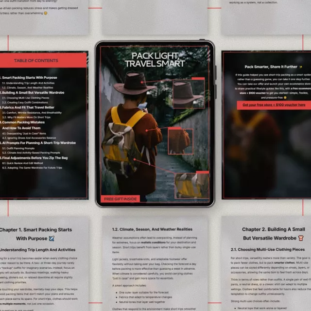 Packing for a short trip shouldn’t feel overwhelming, yet many travelers still struggle with overstuffed bags and outfits that don’t quite work. Pack Light, Travel Smart is a practical, easy-to-follow ebook designed to help you confidently decide what clothes to pack for short trips without stress, guesswork, or last-minute panic. This digital guide walks you through smarter decisions so every item in your bag earns its place, saving you time, space, and energy before you even leave home.