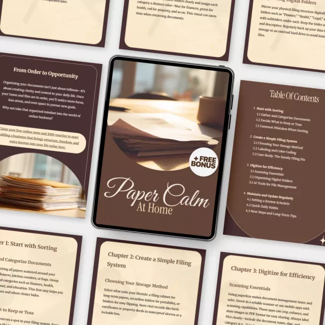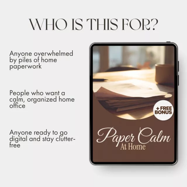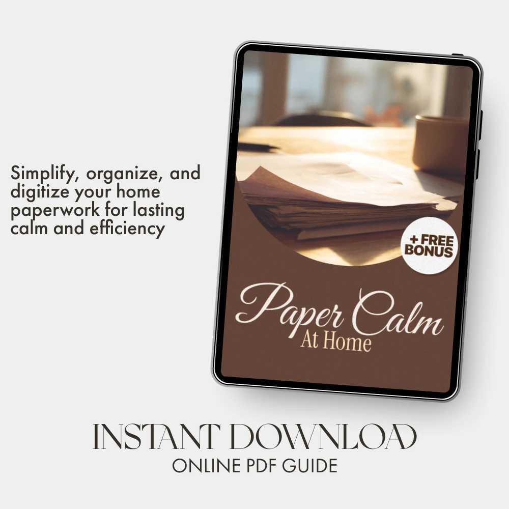Feeling overwhelmed by piles of paper, scattered receipts, or messy folders? Paper Calm at Home is your all-in-one digital download designed to bring calm, order, and clarity to your home paperwork. This easy-to-follow eBook helps you declutter, organize, and digitize your documents step by step—no stress, no confusion, just lasting simplicity. Perfect for busy parents, small business owners, and anyone ready to create a paper system that finally works.