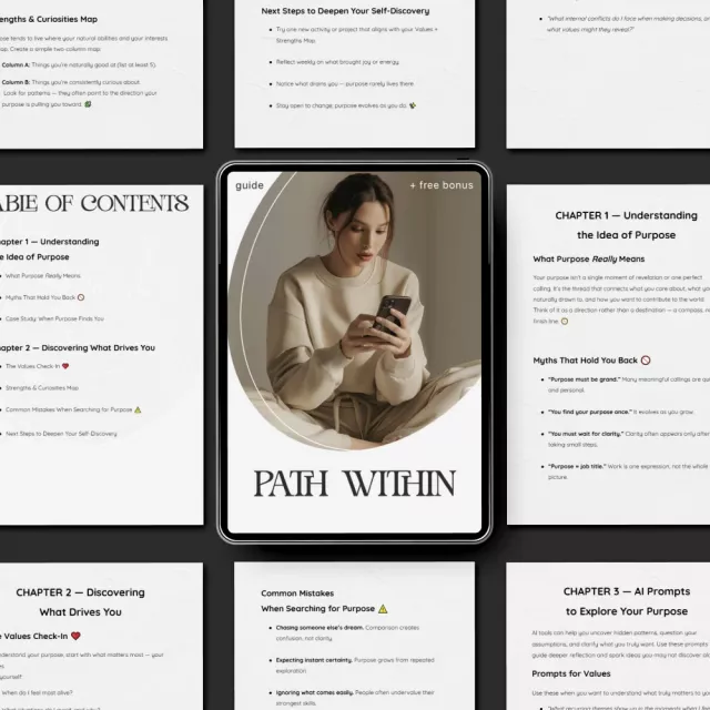 Wow, this guide is something else! It's like a personal mentor for finding your purpose. I've always struggled with understanding what my purpose really means, but the clear breakdown in this guide helped me see through all those myths and misconceptions. And let's not forget about the step-by-step process for identifying core values and motivators β it was so eye-opening! One of my favorite parts was definitely the AI prompts though. They kept things fresh by exploring different aspects of values, decision-making, and meaningful work each day. I felt inspired every single time π Plus there were real-life examples which made everything much more relatable. And you know what? The simple daily actions suggested actually brought alignment to my routine π No big changes or disruptions β just small tweaks that make a huge difference over time.
