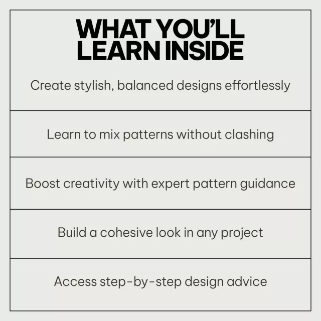 Unlike other similar resources, the Pattern Harmony Rules Bundle provides you with a comprehensive toolkit, including easy-to-follow guides, practical checklists, and insightful eBooks, making it a one-stop solution for pattern mixing enthusiasts. It’s more than just advice; it’s a proven method for achieving harmony in design, tailored to your unique style and preferences.