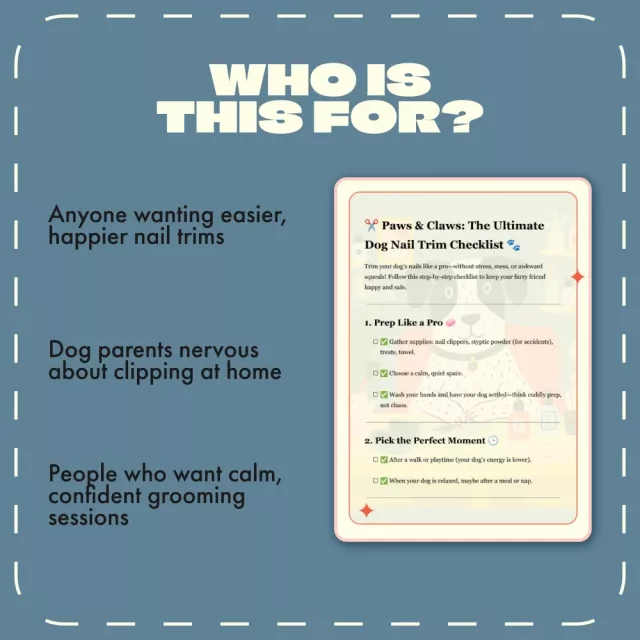 Make nail trims a breeze and keep your furry friend happy, healthy, and stylish. Download “Paws & Claws: The Ultimate Dog Nail Trim Checklist” today and start trimming with confidence — one paw at a time!