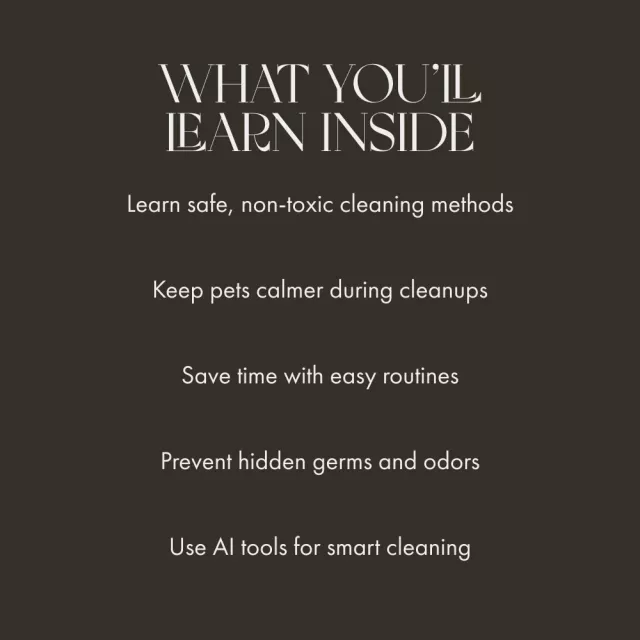 This eBook is for pet owners who want to create a healthier, cleaner environment without exposing their pets to harmful chemicals. It’s ideal for cat and dog owners, new pet parents, or anyone seeking tips for cleaning pet areas safely while using smart and sustainable methods.