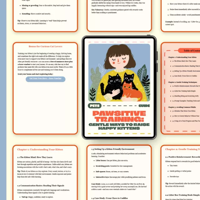 Unlike generic pet manuals, Pawsitive Training combines gentle, reward-based strategies with modern insights—like AI progress tracking and real-life case studies—to help you raise a kitten that feels safe, loved, and eager to learn. Every section is crafted for clarity, compassion, and real-world results.