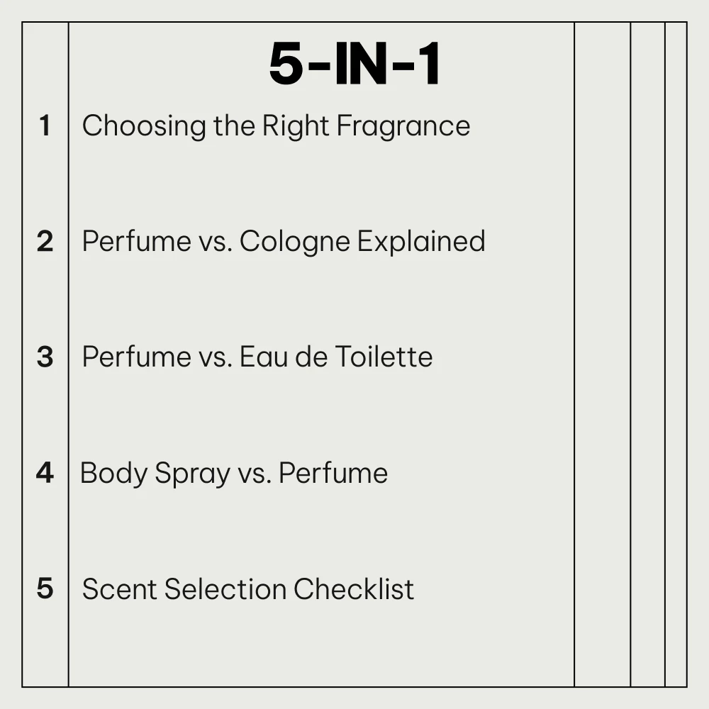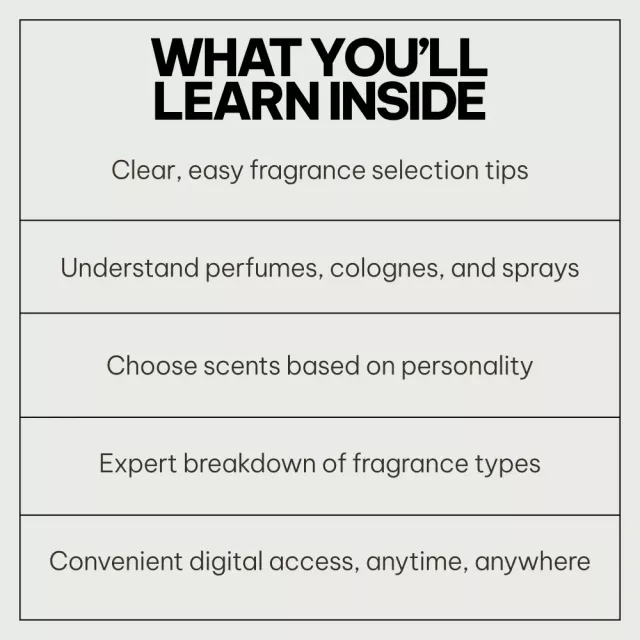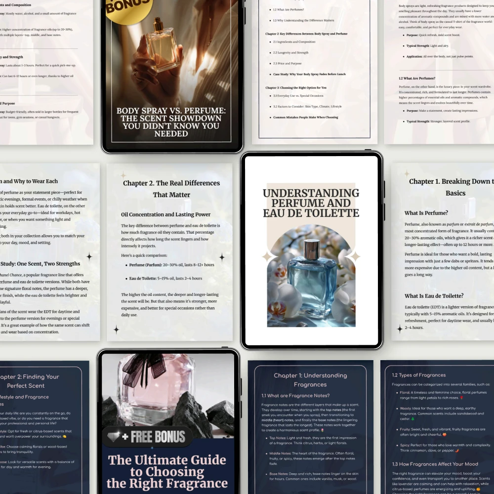 Our carefully curated bundle includes five valuable resources that cover every aspect of fragrance, from choosing the right scent to understanding the key differences between perfumes, colognes, and body sprays. This bundle is your ultimate guide to navigating the fragrant world with ease.