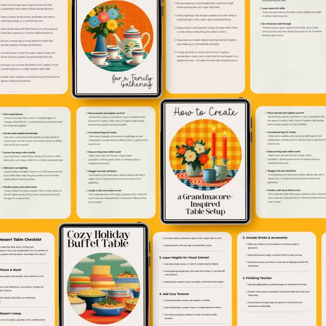 Unlike generic table styling resources, this collection blends family-friendly practicality with cottagecore and grandmacore charm. It focuses on warmth, nostalgia, and togetherness, not perfection. You get multiple themed guides in one bundle, making it easy to adapt your table for desserts, holidays, or casual family tea moments.