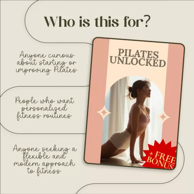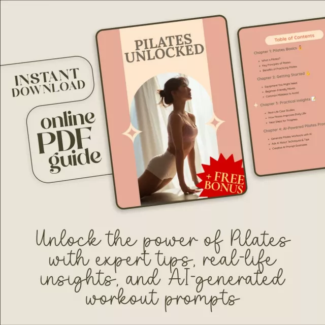 Ready to transform your fitness journey? Pilates Unlocked is the comprehensive digital guide that helps you unlock the full potential of Pilates. Whether you’re a beginner or looking to refine your practice, this guide is packed with essential insights, practical advice, and cutting-edge AI-powered tools to create customized workouts. Dive into the core principles of Pilates, learn effective techniques, and explore real-life examples of how Pilates can enhance your daily life. Plus, with AI-generated Pilates prompts, you’ll never run out of new exercises to try!