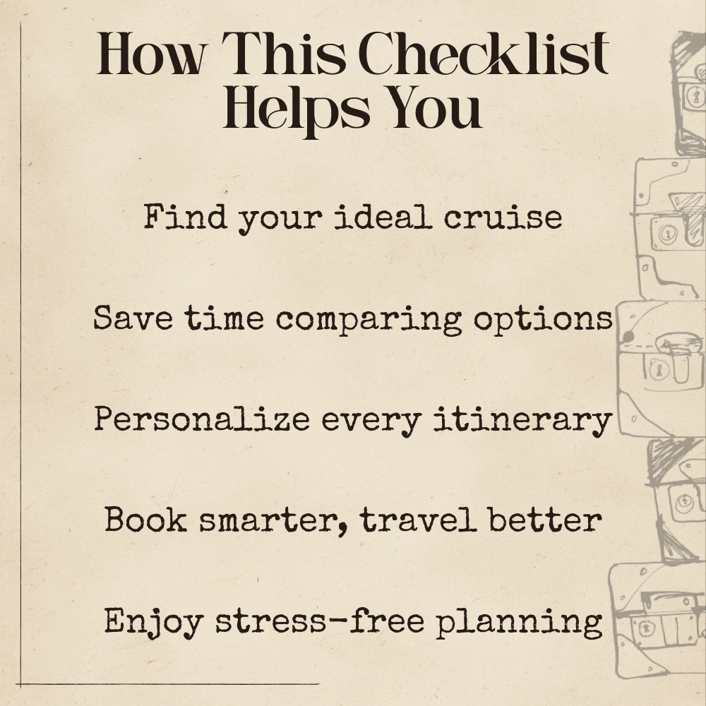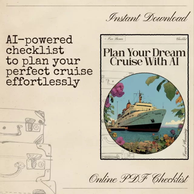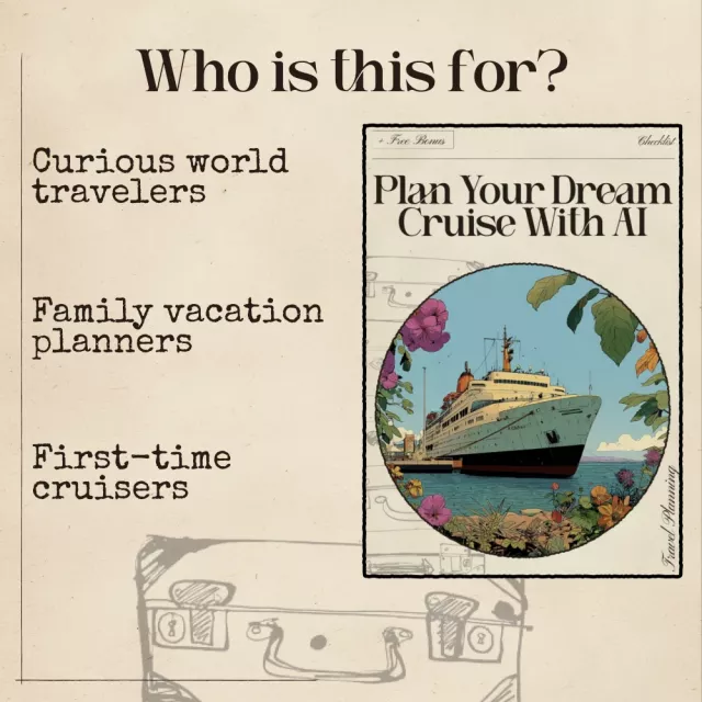 Unlike typical travel planners, this checklist teaches you how to collaborate with AI to find the best cruise routes, cabins, and experiences. It’s designed for real travelers who want clarity, simplicity, and results — not endless research tabs. With actionable prompts and insider-style tips, it turns using ai to plan a cruise into a fun, easy, and empowering process.
