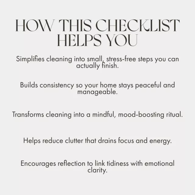 This checklist is perfect for anyone who feels overwhelmed by household chores, experiences anxiety in messy spaces, or wants to connect cleanliness with emotional wellness. It’s especially helpful for students, busy parents, and anyone practicing mindfulness or self-improvement.