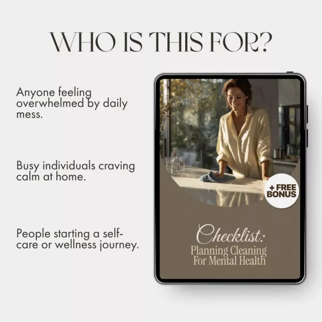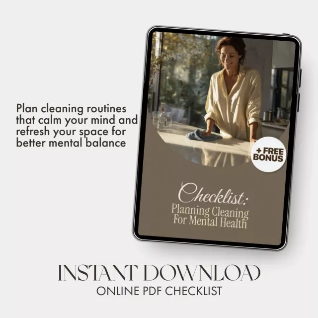 Download your Planning Cleaning for Mental Health checklist today and start creating a cleaning routine that clears both your space and your mind. Turn cleaning into care, clutter into clarity, and routine into renewal—begin your mindful cleaning journey now.